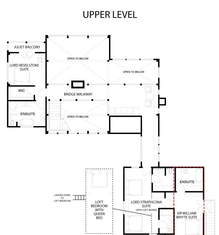 Upper level (Loft Suite): Two en-suite bathrooms, dual walk-in showers in the other, air conditioning, loft bedroom accessible by ladder stairs. Interconnects with bedroom 4.